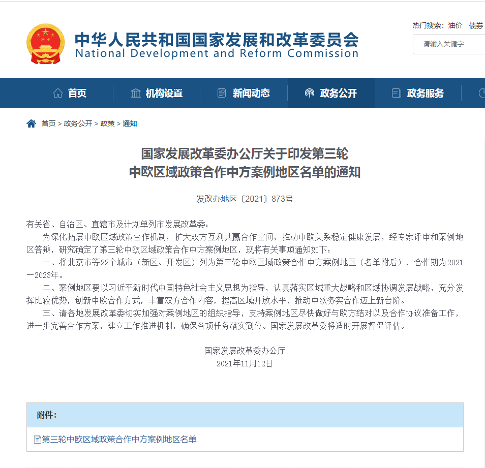 此次发布的为第三轮中方案例地区。总体上看,本轮中方案例地区具有良好的经济社会发展条件、便利的交通区位条件、较高的区域开放水平,与欧合作基础扎实、内容丰富、特色鲜明,符合区域重大战略和区域协调发展战略要求,对所在区域开展对欧合作具有很强的示范带动作用。