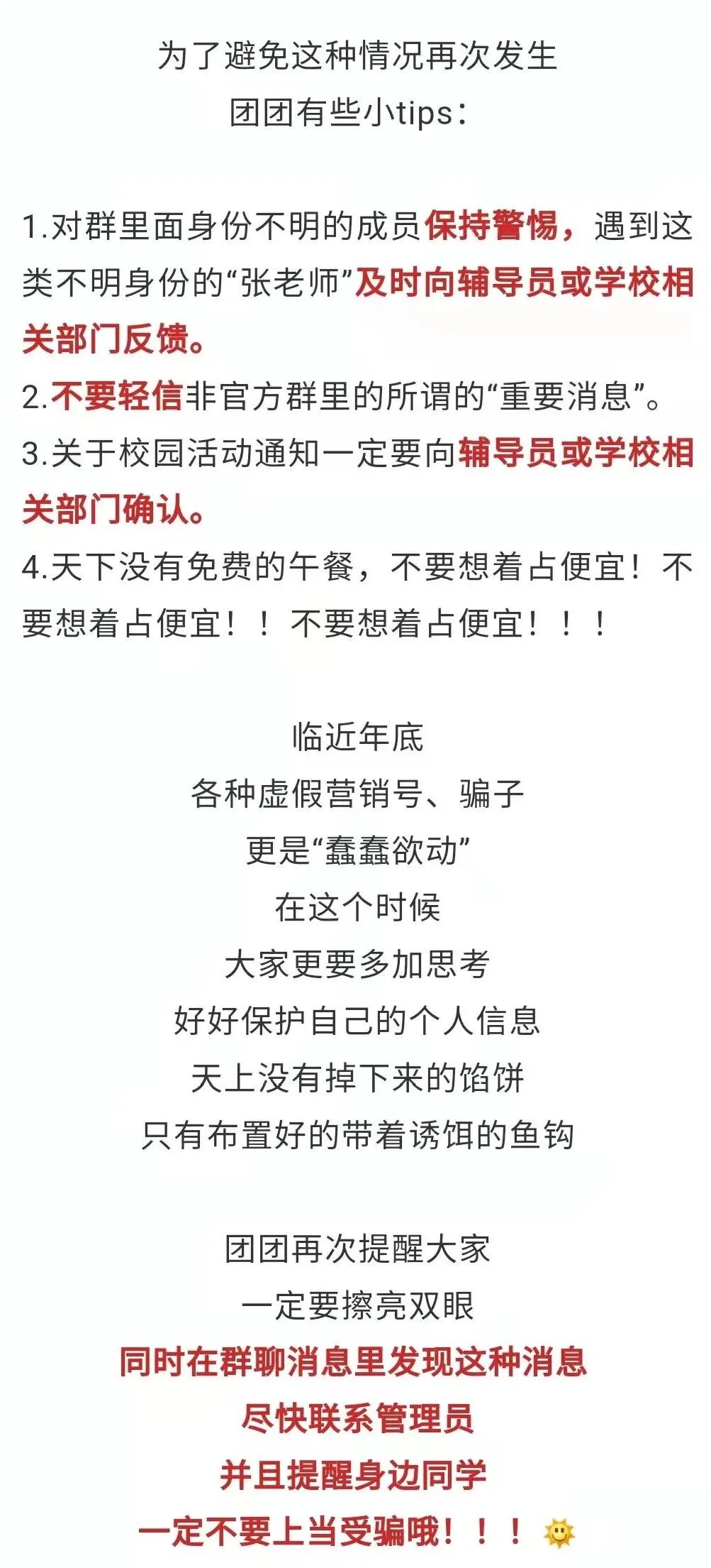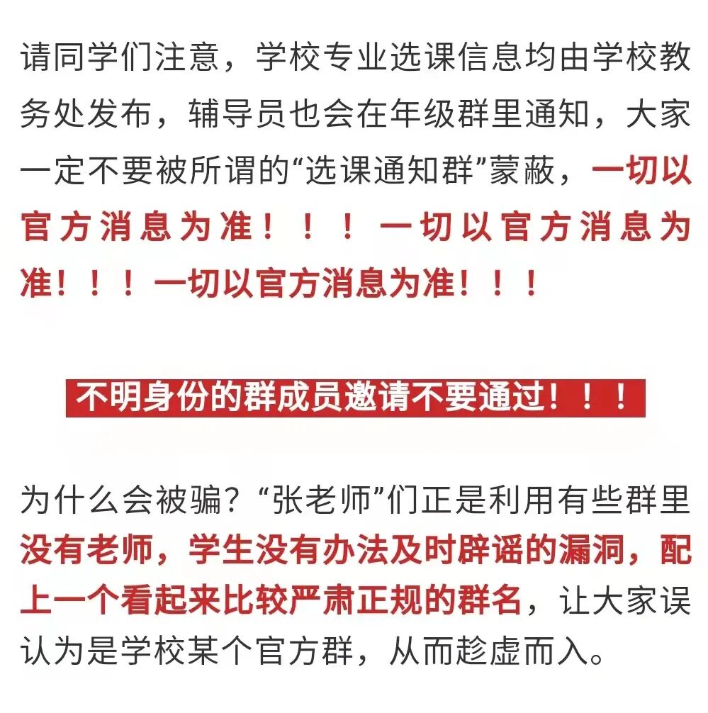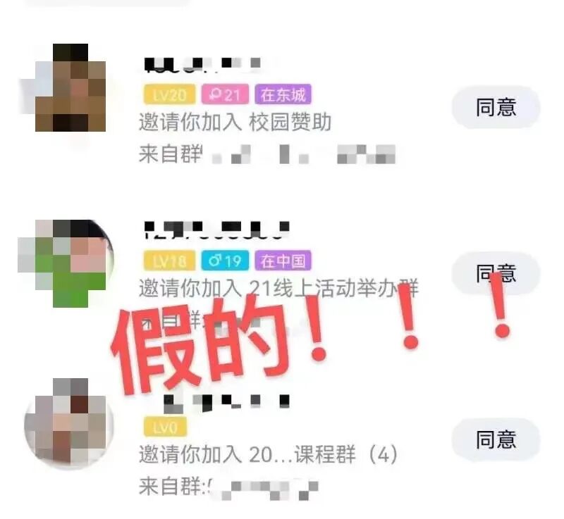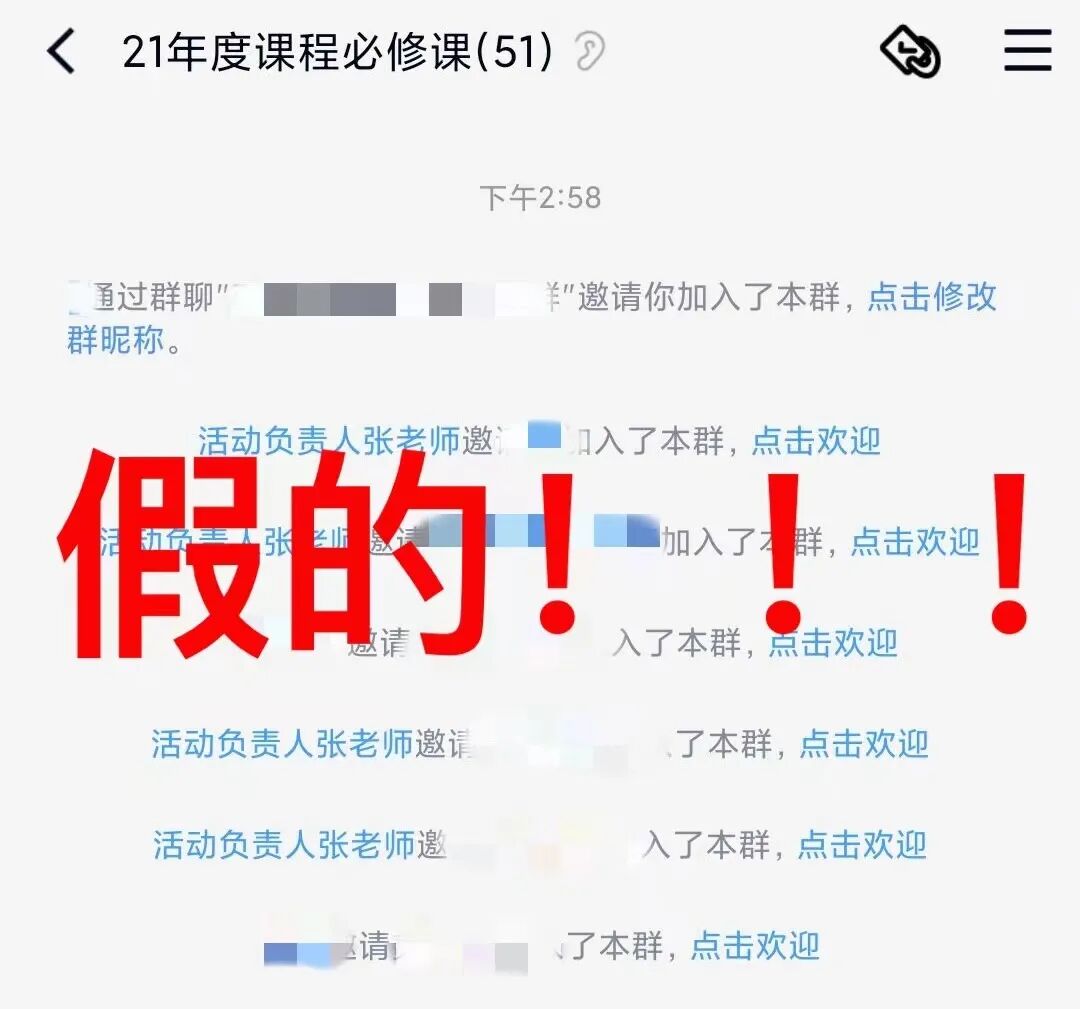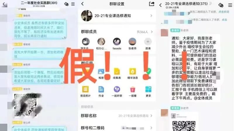 近期,有同学发现自己被莫名其妙地拉入了很多qq群、微信群,群里“张老师”假借团委、学生会、社会实践、社团活动等名义,以免费为大家提供学习资料、大学活动、学校通知等为噱头,拉同学加群,此外,“张老师”还会“热心”地附加活动截止时间,大大增加其可信度。
