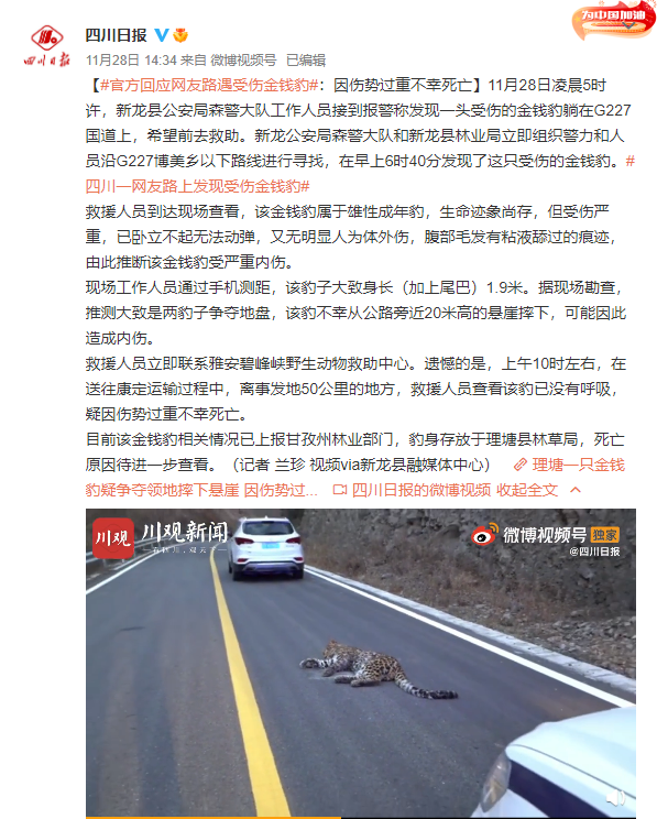 救援人员立即联系雅安碧峰峡野生动物救助中心。遗憾的是,上午10时左右,在送往康定运输过程中,救援人员查看该豹已没有呼吸,疑因伤势过重不幸死亡。