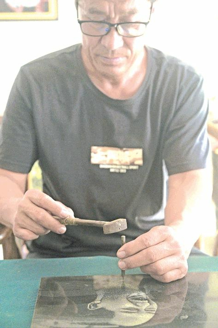 左手拿着特制的钻石笔,右手拿着小锤,小锤子敲打在钻石笔上,钻石笔的笔尖在墨玉上留下细密的小白点。伴随着叮叮当当的敲击声,成千上万的小白点组成活灵活现的画面。