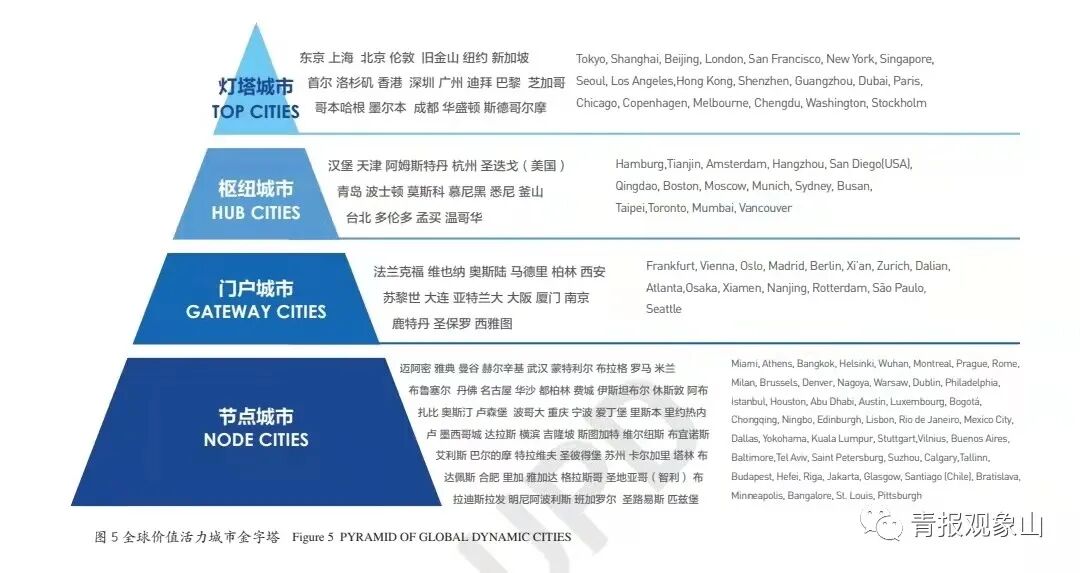 《报告》还发布了全球价值活力城市金字塔,从灯塔城市、枢纽城市、门户城市、节点城市四个维度,发布了入选城市名单。其中,青岛与汉堡、天津、阿姆斯特丹、杭州、圣迭戈(美国)、波士顿、莫斯科、悉尼、釜山、台北、多伦多、孟买、温哥华等城市进入“枢纽城市”。北京、上海、香港、深圳、广州等城市跻身“灯塔城市”。
