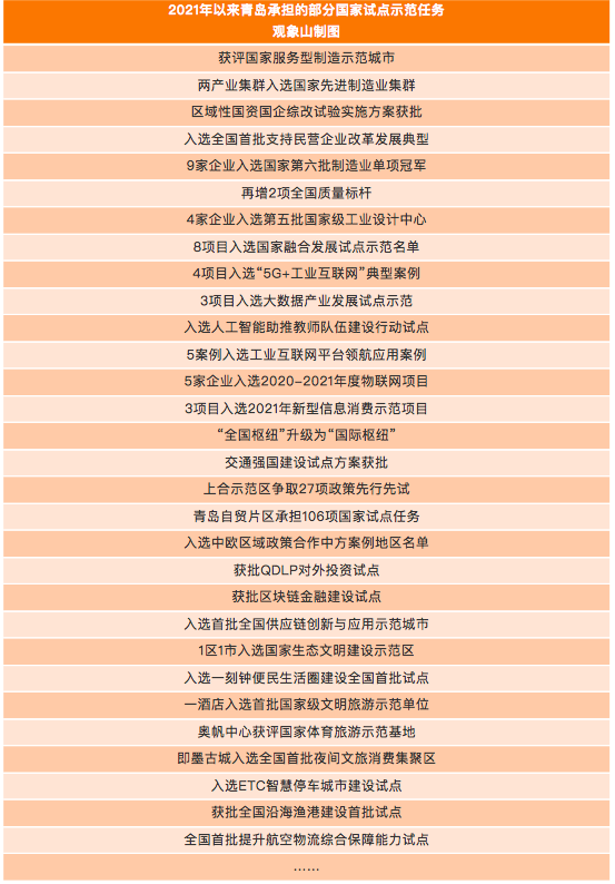 身居对外开放前沿、敢闯敢试的青岛,历来是改革开放的先行者、“试验田”。今年以来,青岛立足自身实际,发挥特色优势,寻找城市发展与国家发展大局之间的“契合点”,积极主动服务、融入国家战略,被国家赋予一系列试点、示范任务——