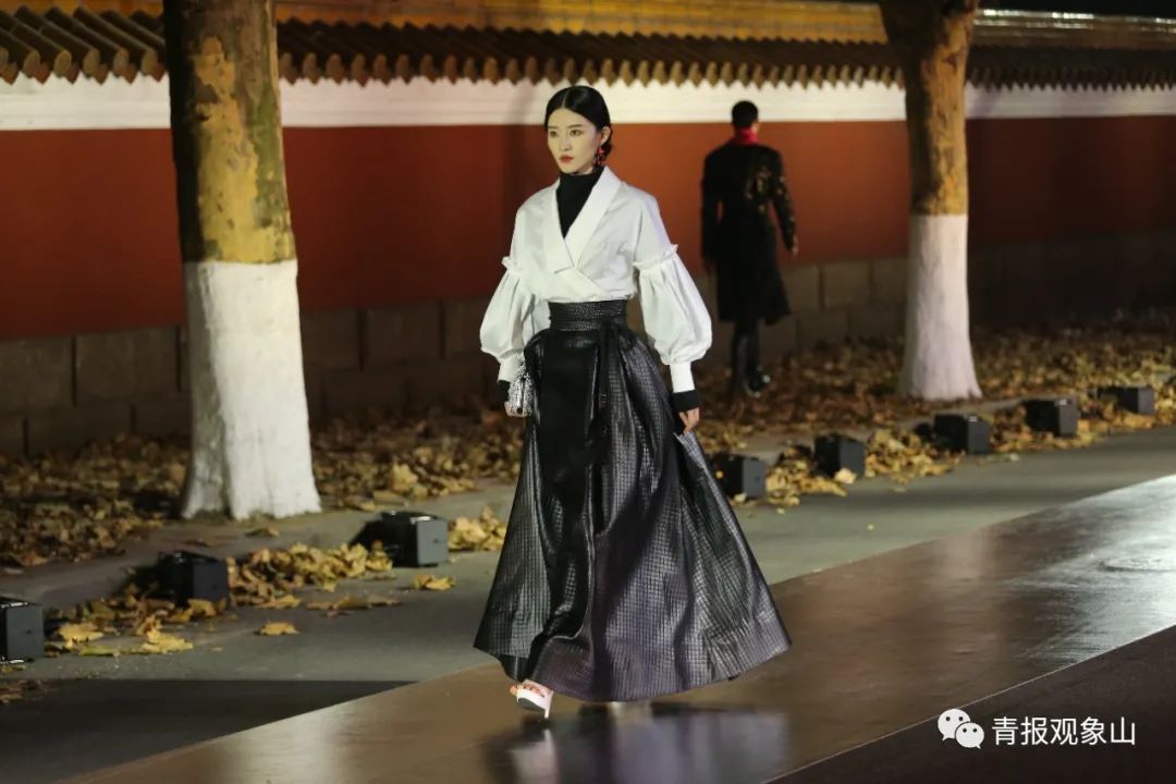 踏着动感的音乐节拍,模特们走在极具青岛特色的“天然”T台上,头顶是装饰得流光溢彩的古树,脚下是质朴浪漫的落叶,各式服装与身旁暗红色的墙面交相辉映,文化底蕴与自然风味并行不悖,科技感与时尚裹挟在一起感扑面而来。