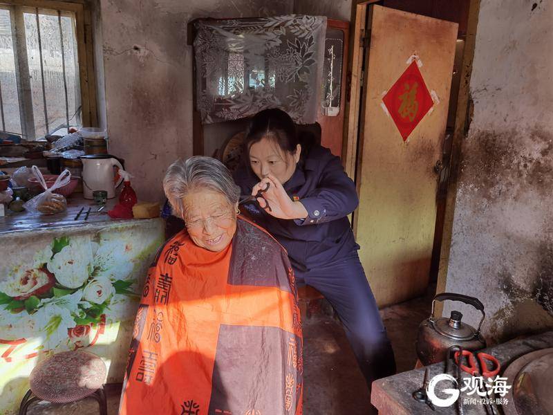 青岛日报社/观海新闻12月14日讯 崂山区王哥庄街道曲家庄社区爱心服务队网格员顾爱娜,在巡查中获悉92岁社区居民梁女士因腿脚不便,较长时间没有理发,联系了其他网格员带着理发工具包来到了梁女士家,为其理发。
