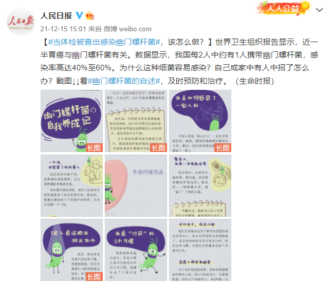 当我们体检时被查出感染幽门螺杆菌,该怎么做? 2021-12-15 19:08 人民日报微博 0 世界卫生组织报告显示,近一半胃癌与幽门螺杆菌有关。数据显示,我国每2人中约有1人携带幽门螺杆菌,感染率高达40%至60%。为什么这种细菌容易感染?自己或家中有人中招了怎么办?戳图↓↓看幽门螺杆菌的自述,及时预防和治疗。 微博截图 责任编辑:程雪涵