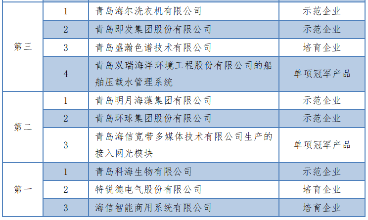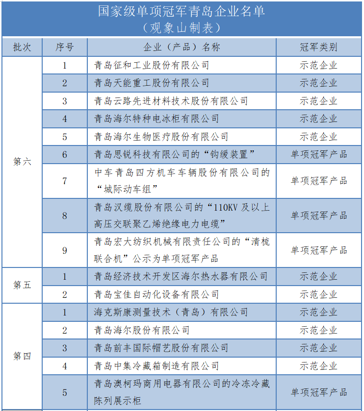 日前,工业和信息化部公示了第六批制造业单项冠军和第三批通过复核企业名单。青岛一口气拿下5家示范企业、4个冠军产品共9个席位,相当于此前第一二三批次入选的总和,创下自参评以来单批入选最高数量。公示期后如无异议,青岛制造业单项冠军将达到26家(包含3家培育企业),位列全国第7。