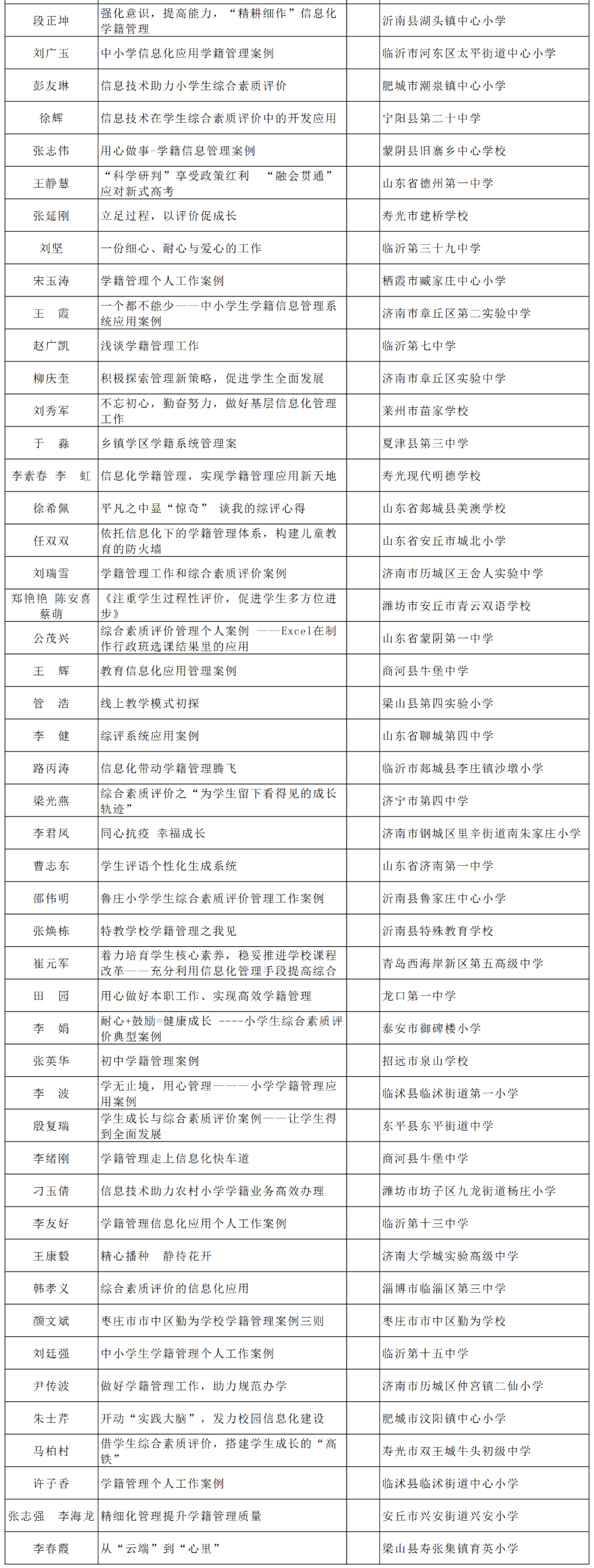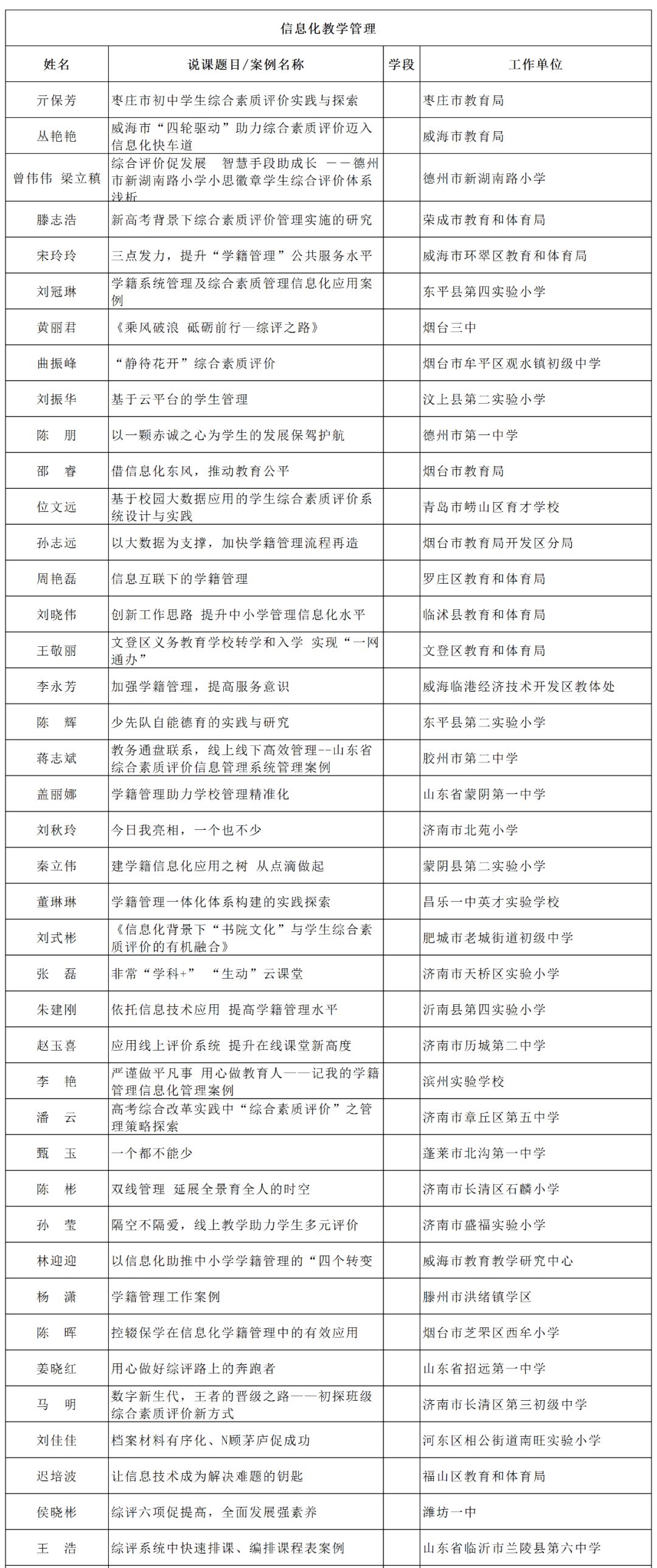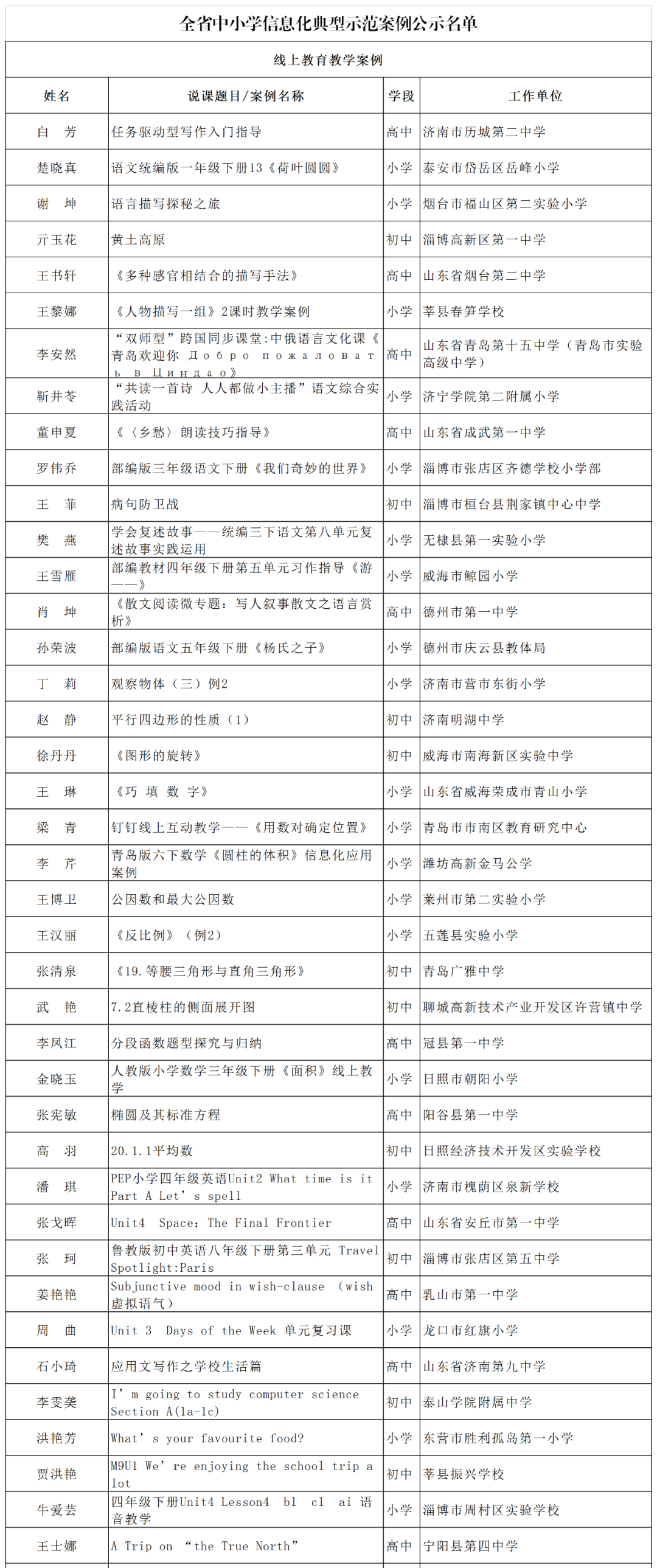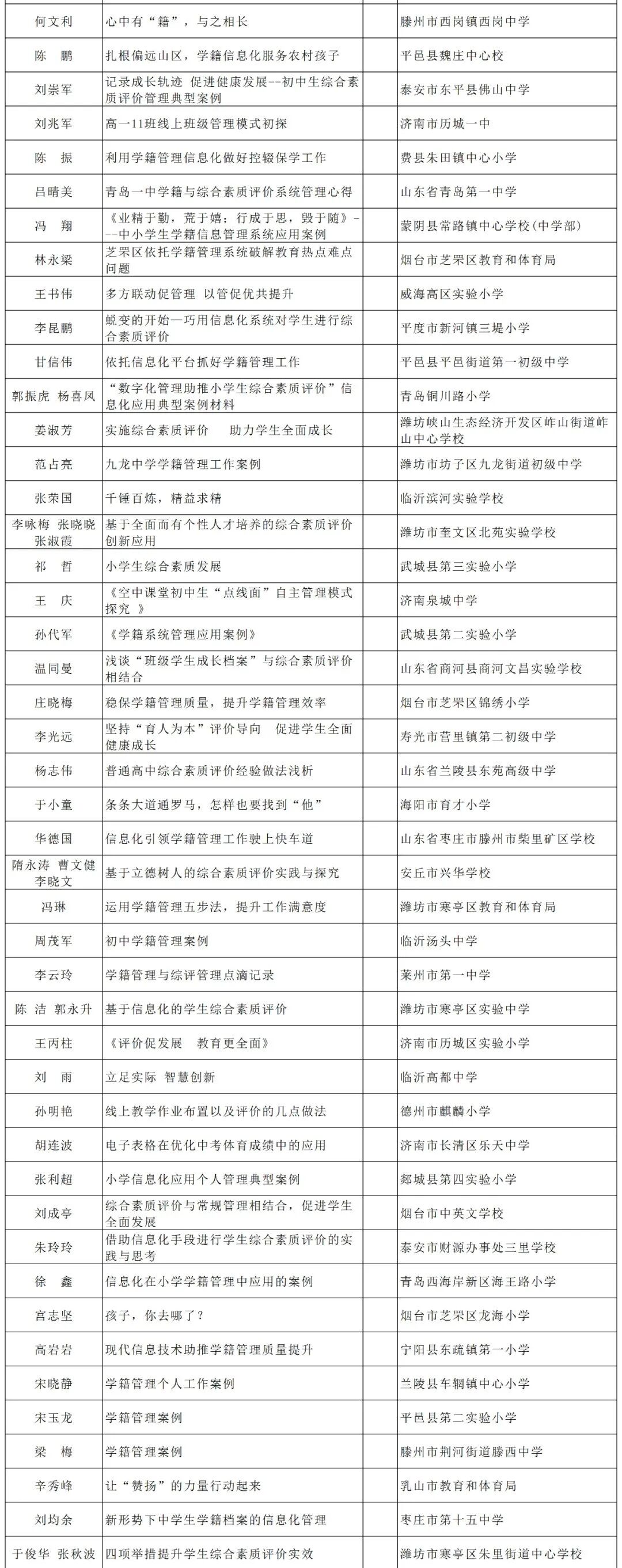 根据《山东省教育厅关于举办2020年全省中小学实验教学说课和信息化典型示范案例征集活动的通知》要求,经各市推荐,通过网上申报、专家评审等程序,最终确定线上教学82项、信息化管理177项为省级典型示范案例,现予以公示,公示期为2020年9月21日至2019年9月25日。