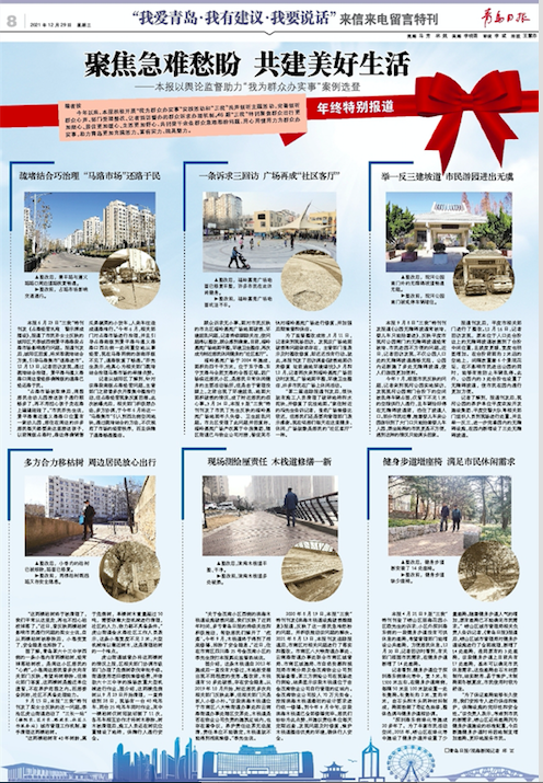 今年以来,本报积极开展“我为群众办实事”实践活动和“三我”民声倾听主题活动,完善倾听群众心声、部门受理整改、记者回访督办的群众诉求办理机制。46期“三我”特刊聚焦群众出行更加顺心、居住更加暖心、生活更加舒心,共刊登千余条群众急难愁盼问题,用心用情用力为群众办实事,助力青岛更加充满活力、富有实力、独具魅力。
