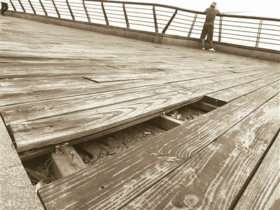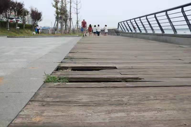 据介绍,这条木栈道自2012年建成后一直没有大修过,木地板受潮出现不同程度的变形。整改前,木栈道有50多处破损,存在安全隐患。从2019年10月开始,附近居民多次向相关部门反映此事,但相关部门只是派人小修小补。“该段滨海木栈道位于市南区八大峡街道办事处和云南路街道办事处辖区交界处,木栈道是否在物业公司负责的建筑红线内,也存在着争议,养护责任边界无法厘清,责任单位不能确定,木栈道就不能得到彻底维修。”李先生说。