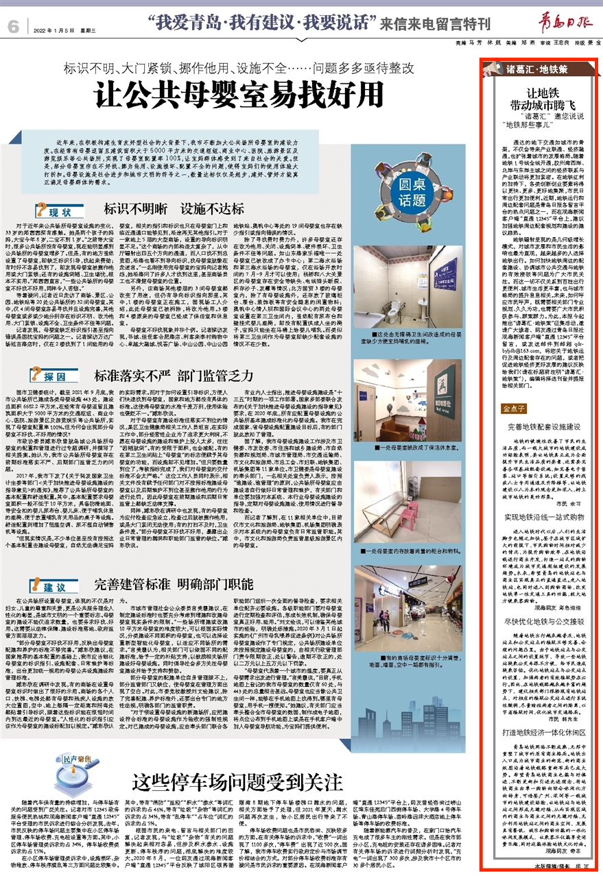 地铁辐射呈现的是几何级增长模式,对城市发展和市民生活的影响也最为直观,越来越多的人选择地铁出行。如何加快地铁周边的配套建设、协调城市公共交通与地铁的有效接驳等问题为广大市民关注。而这一切不仅关系到百姓出行更便利、城市生活更丰富,也与城市格局的提升息息相关。未来,如何呼应市民呼声,既需要相关部门专业规划、久久为功,也需要广大市民积极参与、群策群力。为此,本报今起推出“诸葛汇·地铁策”征集活动,邀请广大读者、网友通过青岛日报社观海新闻客户端“直通12345”平台留言,或发送邮件到邮箱qdrbyljdb@163.com,将您关于地铁运行及周边配套存在的问题,或者把促进地铁经济更好发展的建议反映给我们(请在标题前注明“诸葛汇·地铁策”),编辑将择选刊登并提报给相关部门。