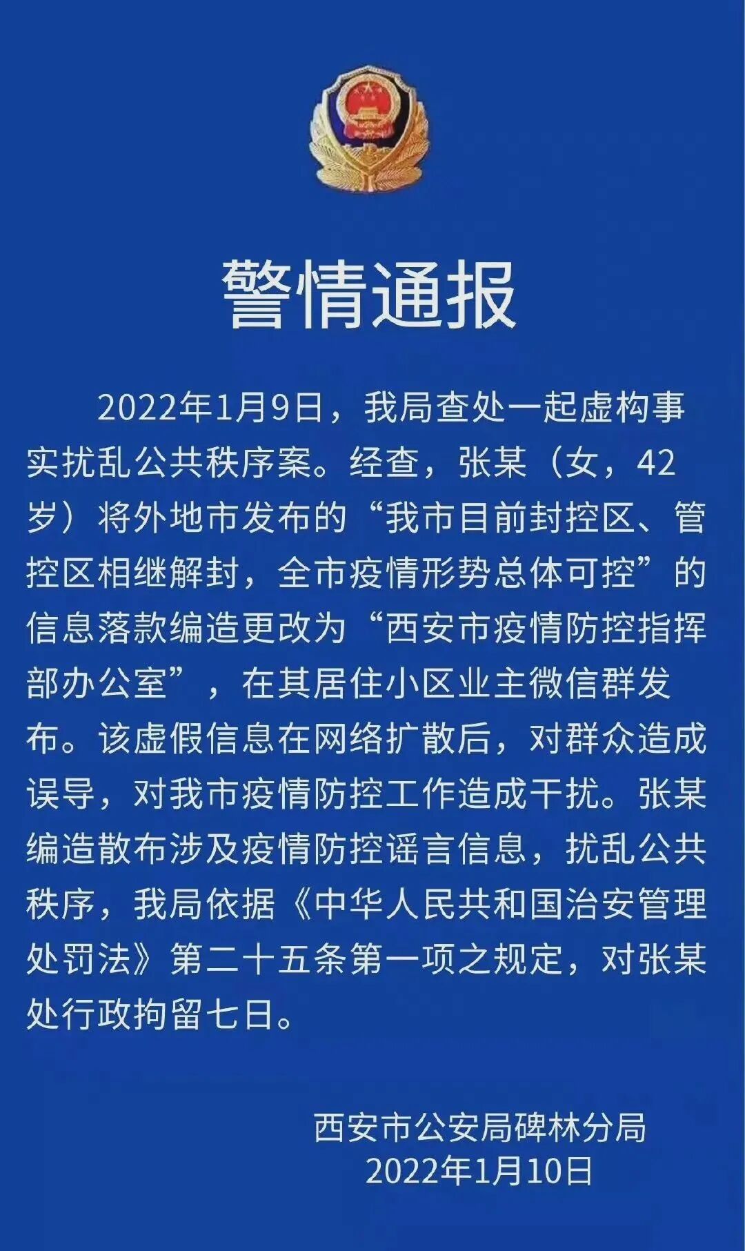 1月9日,西安市碑林区张某(女,43岁)“想着西安疫情形势逐渐好转,我就私自把咸阳解封的消息改成西安,发在了微信群里,本想让大家轻松一下”,将咸阳市发布的疫情防控通知落款编造更改为“西安市疫情防控指挥部办公室”,在其居住小区业主微信群发布。严重误导群众,干扰西安市疫情防控。西安公安碑林分局依法对张某处行政拘留七日。