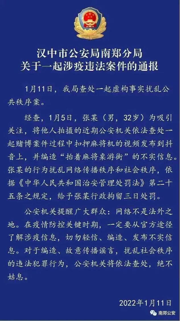 1月11日,汉中市公安局南郑分局查处一起虚构事实扰乱公共秩序案。经查,1月5日,张某(男,32岁)为吸引关注,将他人拍摄的近期公安机关依法查处一起赌博案件过程中扣押麻将机的视频发布到抖音上,并编造“抬着麻将桌游街”的谣言。1月11日汉中公安南郑分局依法对张某处行政拘留三日。