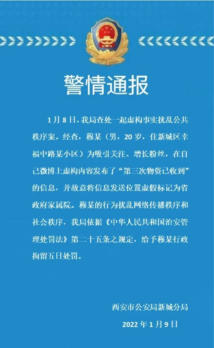 1月8日,穆某(男,20岁)为吸引关注、增长粉丝,在自己微博上虚构内容发布了“第三次物资已收到”的信息,并故意将信息发送位置虚假标记为省政府家属院。穆某的行为扰乱网络传播秩序和社会秩序,西安公安新城分局依法对穆某处行政拘留五日。