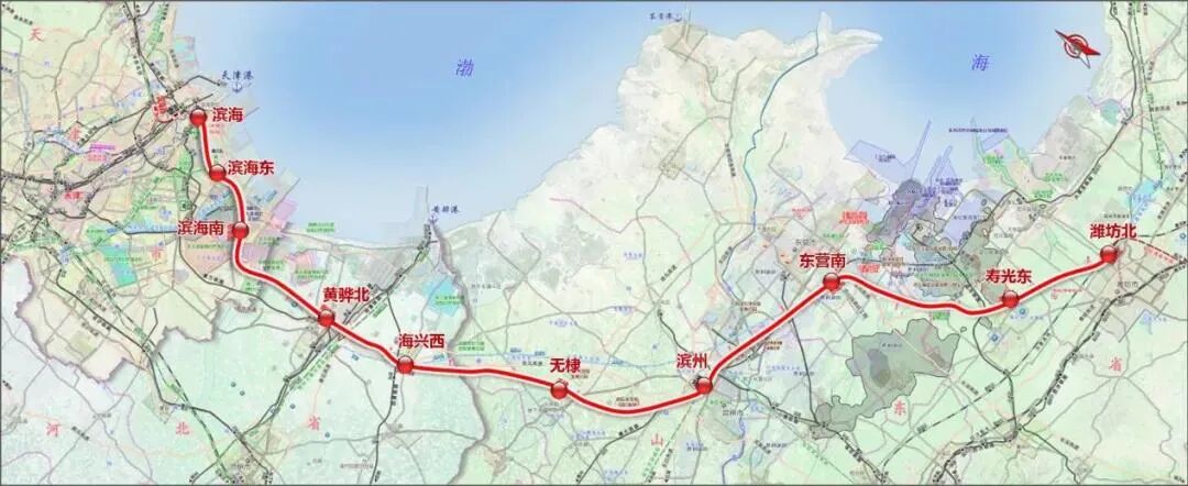 线路起自京津城际铁路延伸线滨海站,经天津市滨海新区、河北省沧州市、山东省滨州市、东营市、潍坊市,终至济青高速铁路潍坊北站,全长约348.9公里,设站10座。同步建设本线至济南联络线150.7公里,本线至津秦高速铁路、京滨城际铁路、济青高速铁路等联络线共约33公里。设计速度:350公里/小时。规划远景年输送能力:单向4500万人/年。