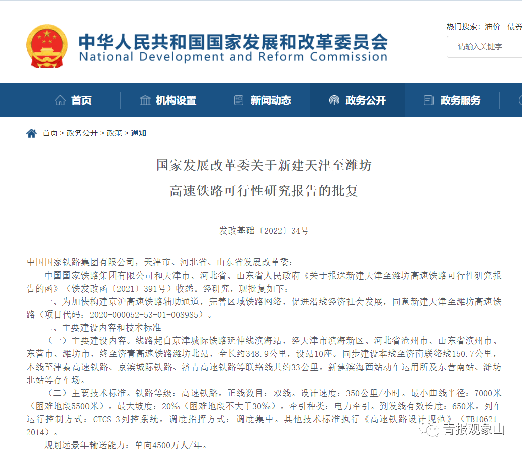 1月14日,国家发改委公布《关于新建天津至潍坊高速铁路可行性研究报告的批复》:为加快构建京沪高速铁路辅助通道,完善区域铁路网络,促进沿线经济社会发展,同意新建天津至潍坊高速铁路。