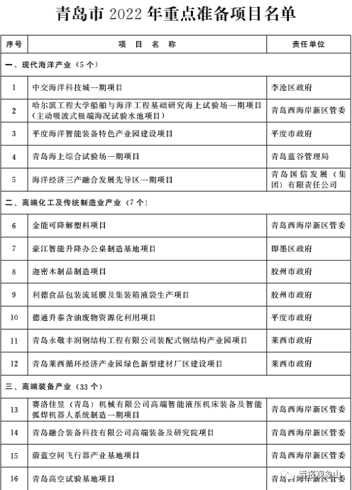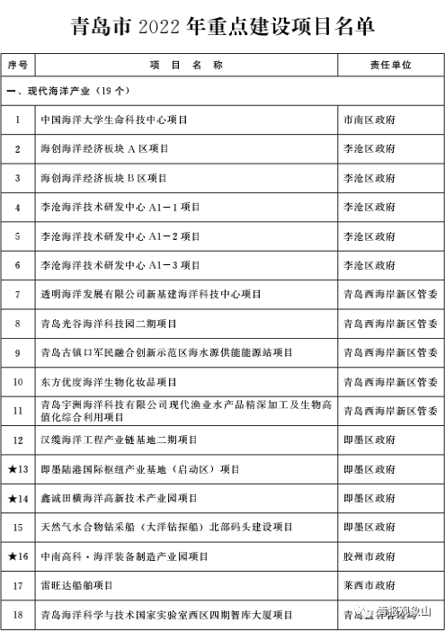 1月10日,青岛市人民政府印发《关于公布青岛市2022年重点项目名单的通知》(简称《通知》)。