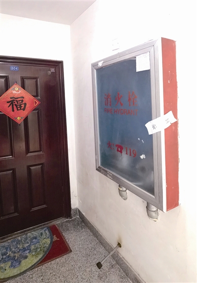 ■福临万家二期居民楼内消防器材箱贴有封条和巡检签字表。