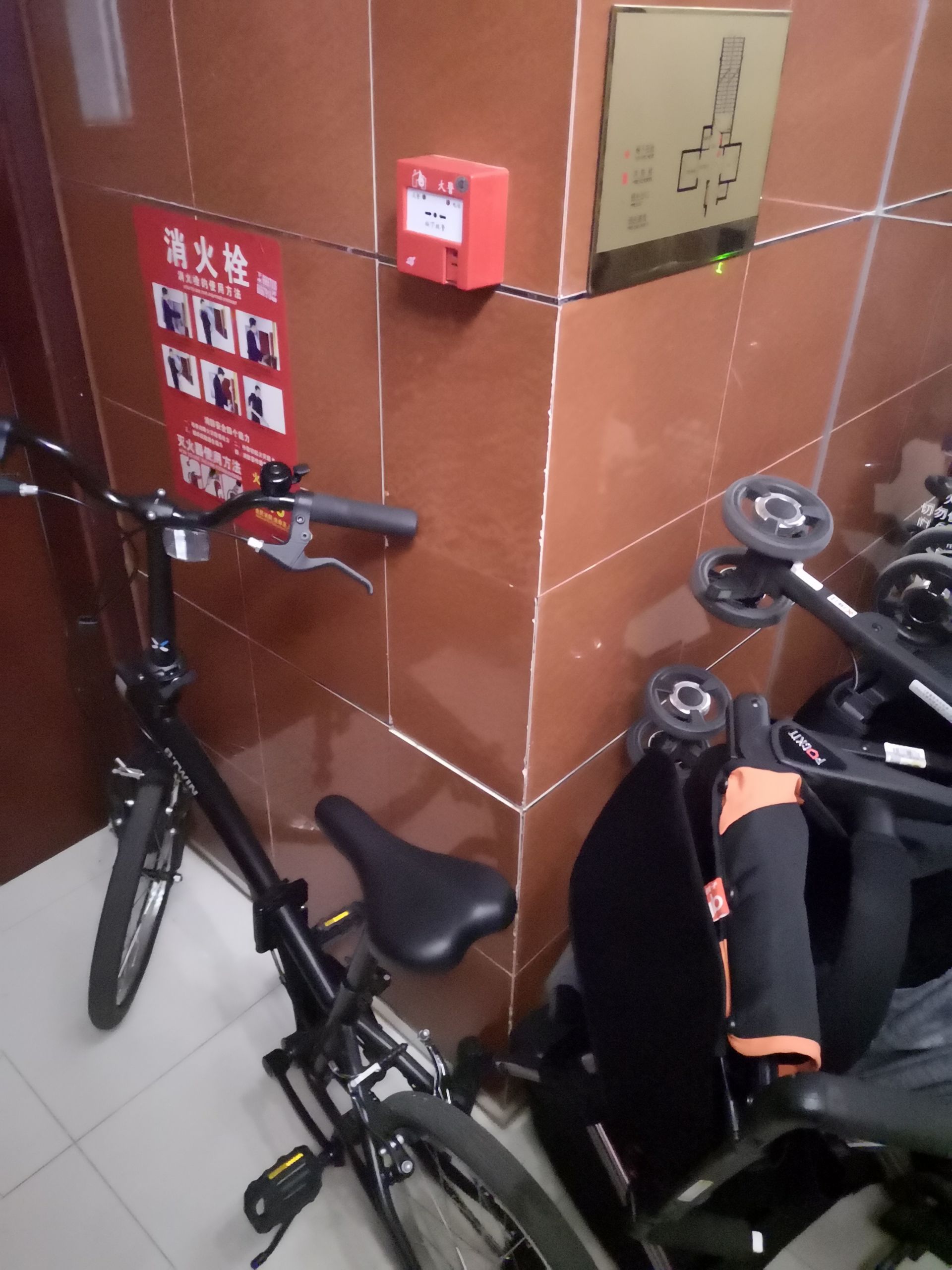 ■晓港名城一期部分居民楼电梯间内的杂物遮挡了消火栓。