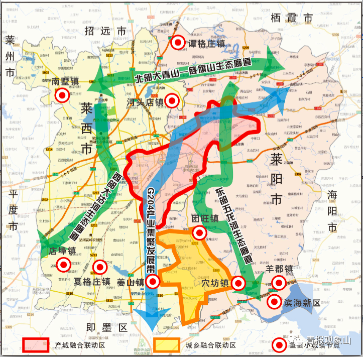 在发展布局上,以204国道产业集聚发展带为引领,打造产城融合、城乡融合2个联动区,构筑东部五龙河、北部大青山-旌旗山、西部大沽河三大生态廊道,统筹推进夏格庄、店埠、羊郡、穴坊等重点区域城镇化建设,实现优势互补、整体提升。