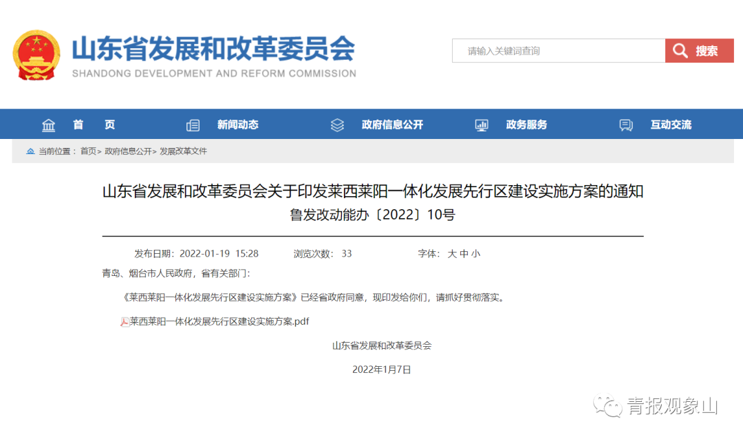 1月19日,山东省发改委官方网站发布信息:经山东省政府同意,省发改委印发《莱西莱阳一体化发展先行区建设实施方案》(简称《方案》),标志着全省首个区域一体化发展先行区获批建设。