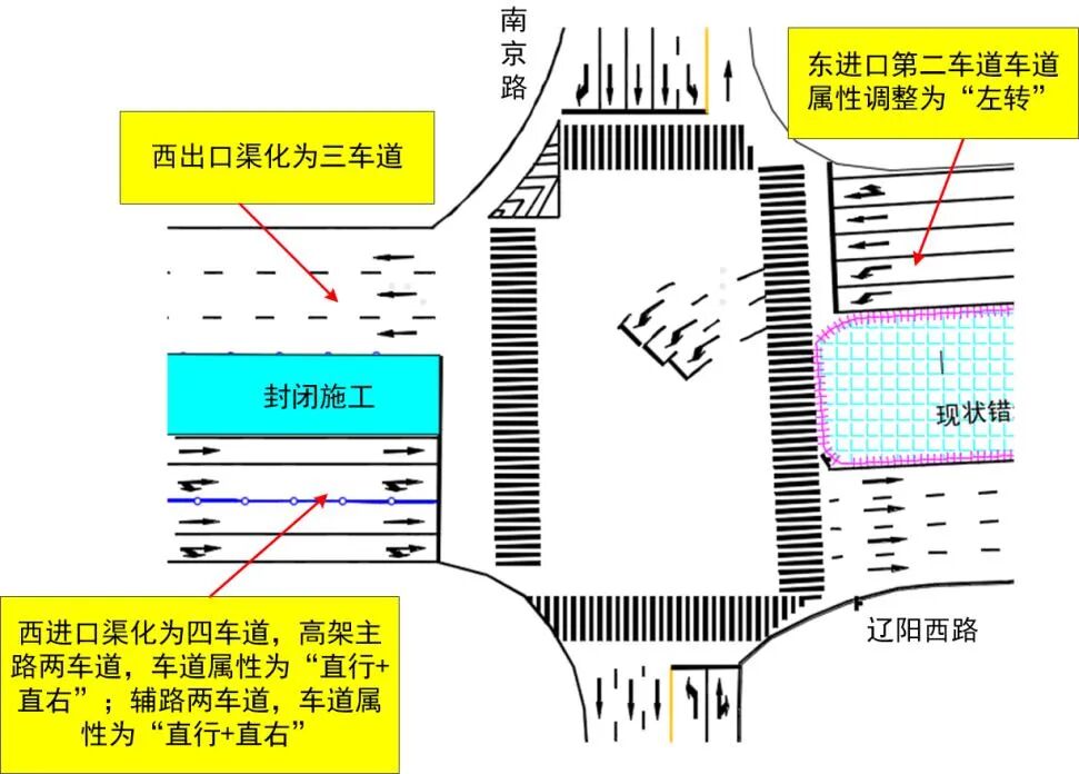 (1)辽阳西路南京路路口,封闭南京路路口西侧辽阳西路中间车道,路口取消掉头车道。