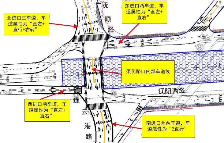 辽阳西路抚顺路路口车行道数量及行车方向基本保持现状,局部车行道位置进行渠化调整。