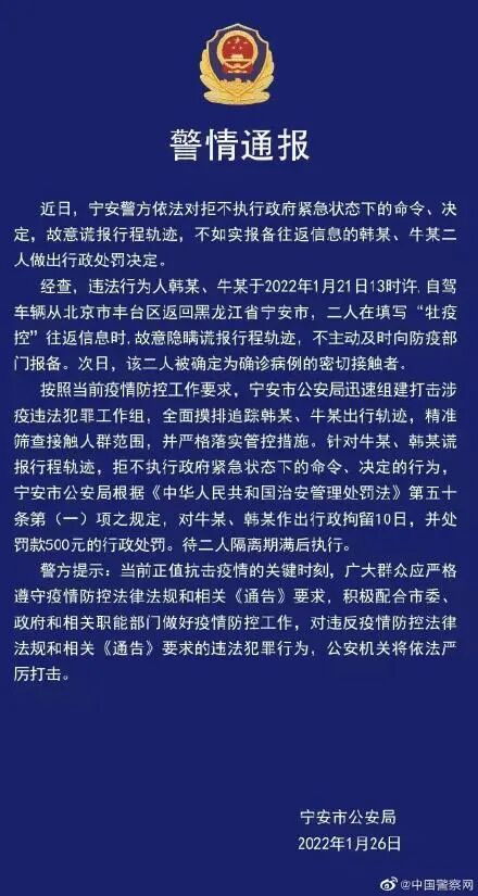 据黑龙江宁安市公安局1月26日通报,违法行为人韩某、牛某于2022年1月21日13时许,自驾车辆从北京市丰台区返回黑龙江省宁安市,二人在填写“牡疫控”往返信息时,故意隐瞒谎报行程轨迹,不主动及时向防疫部门报备。次日,该二人被确定为确诊病例的密切接触者。对牛某、韩某作出行政拘留10日,并处罚款500元的行政处罚。待二人隔离期满后执行。