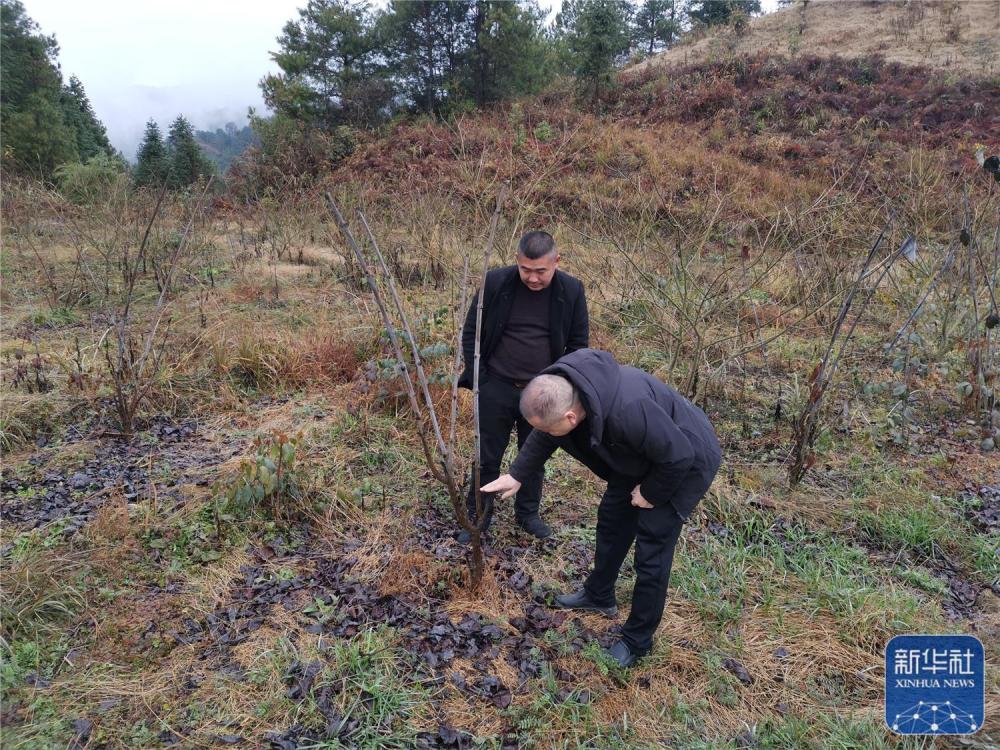 剑河县钩藤产业技术人员向欧明富(左)讲解药材管护技术。新华社记者汪军 摄