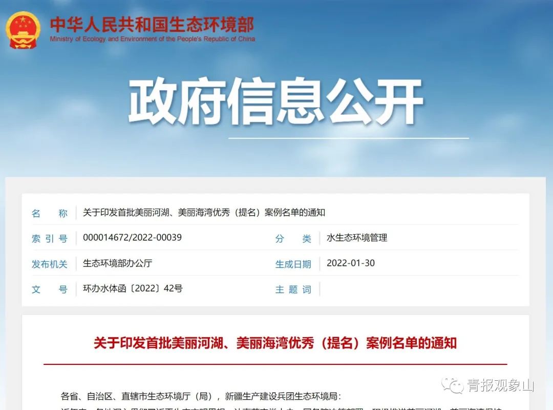 2022年1月30日,生态环境部办公厅印发《首批美丽河湖、美丽海湾优秀(提名)案例名单》,其中包括18个美丽河湖案例(其中9个为优秀案例、9个为提名案例),8个美丽海湾案例(其中4个为优秀案例、4个为提名案例)。