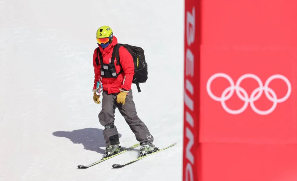 2月6日,男子滑降比赛宣布延期举行后,一名工作人员从雪道上滑下。新华社记者 陈斌 摄