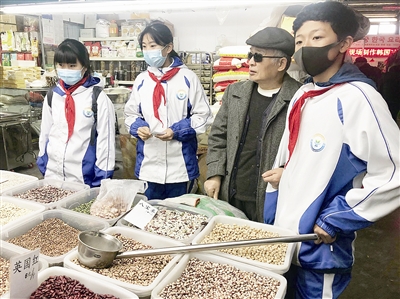 3名小志愿者陪失明老人选购干果。黄飞 摄