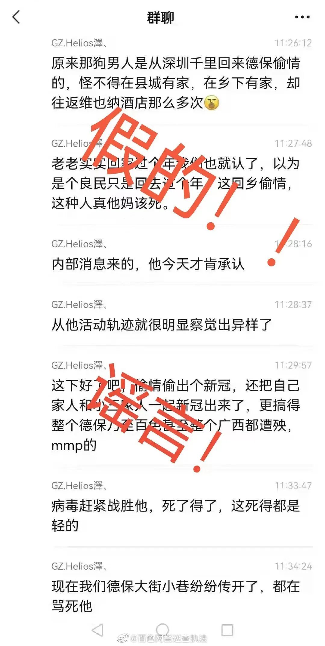 据百色卫健委官方消息称:近日,多张“广西百色德保毒王许某某从深圳回德保偷情引发新冠疫情”的微信聊天记录在社交平台上引发热议,有网友对许某某进行攻击,称其“德保毒王”等等,这些言论造成了很大的负面影响。经排查,网传消息不属实,许某某系回村吃饭时造成多人传染。