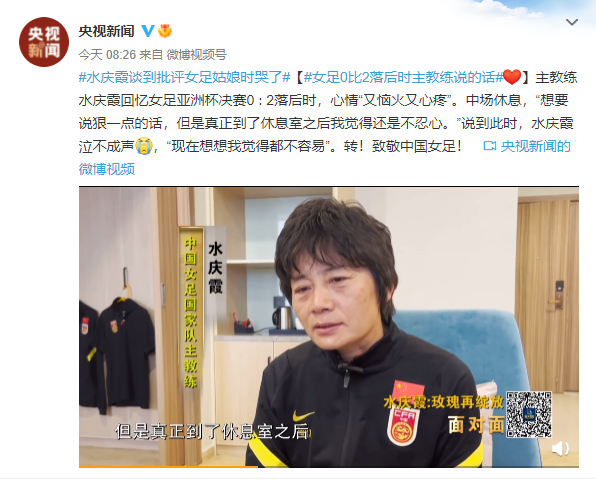 【女足0比2落后时主教练说的话】主教练水庆霞回忆女足亚洲杯决赛0∶2落后时,心情“又恼火又心疼”。中场休息,“想要说狠一点的话,但是真正到了休息室之后我觉得还是不忍心。”说到此时,水庆霞泣不成声,“现在想想我觉得都不容易”。转!致敬中国女足!