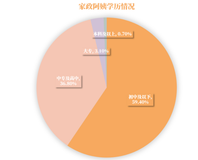 调查显示,目前家政阿姨学历水平整体不高,初中及以下学历占比59.4%,中专及高中学历占比36.8%,大专及以上学历占比3.8%。对比2020年上岗阿姨中,学历在大专及以上的占比降低了3.4%,与2018年比降低了2.95%,这与新入职阿姨的来源有关,她们大多来自贫困地区,学历低,年龄大。