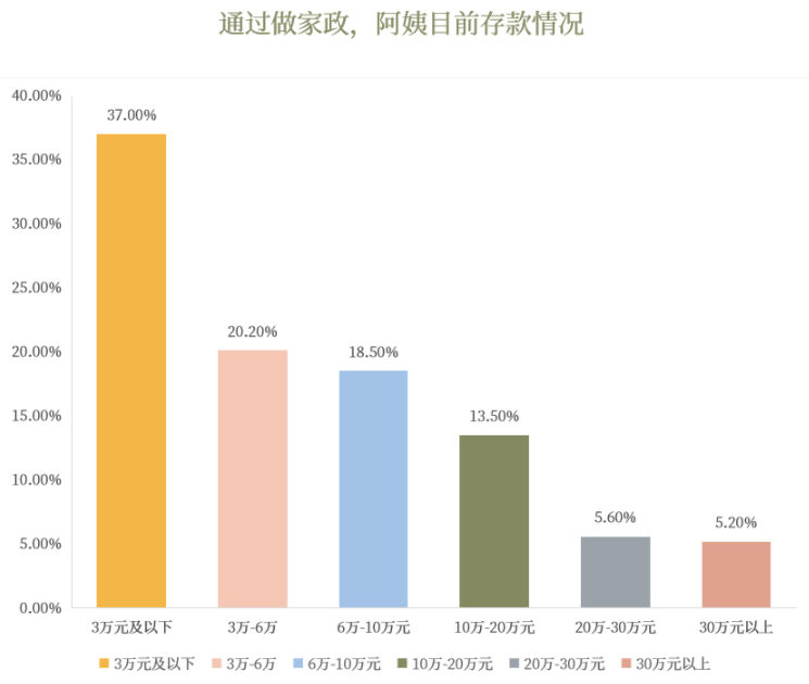 调查问卷数据显示,1.1%的阿姨月收入超过15000元,6.9%的阿姨月收入在10001至15000元之间,18.6%的阿姨月收入在8001至10000元之间,39.3%的阿姨月收入在6001至8000元之间,28.6%的阿姨月收入在4001至6000元之间,仅有5.5%的阿姨月收入低于4000元。在调查中,24.3%的阿姨表示存款超过10万元,甚至有5.2%的阿姨存款在30万元以上。大部分阿姨对自己的收入比较满意,表示做一年家政基本脱贫,做两年家政致富,做三年家政就可以购买房产了。