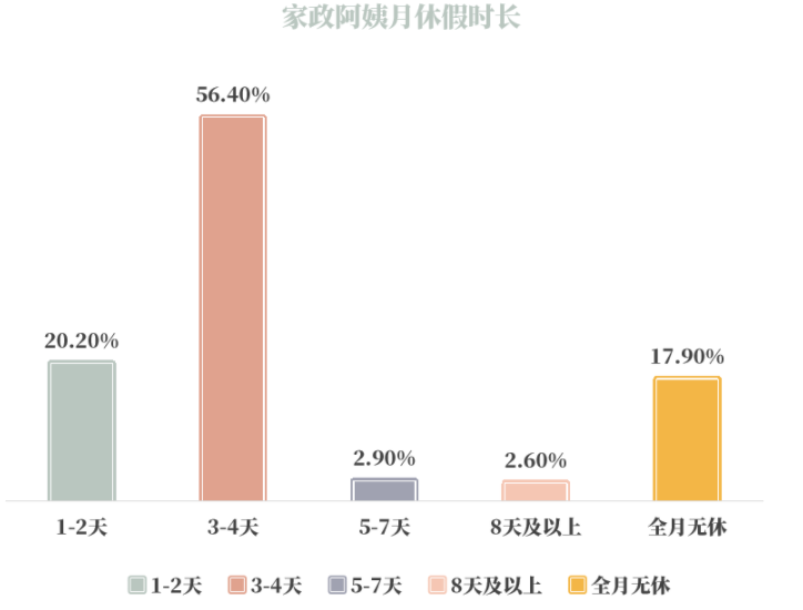 家政阿姨从事照料服务工作时间长、强度大。2021年阿姨们年平均在岗时间301天,68.6%的阿姨年在岗时间高达10个月及以上,与家庭亲人长期处于分离状态,11.7%的阿姨有三年及以上的时间没有回家过年了。