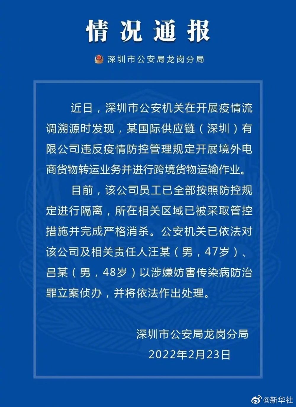 深圳市公安局龙岗分局23日通报,近日,公安机关在开展疫情流调溯源时发现,某国际供应链(深圳)有限公司违反疫情防控管理规定开展境外电商货物转运业务,并进行跨境货物运输作业。