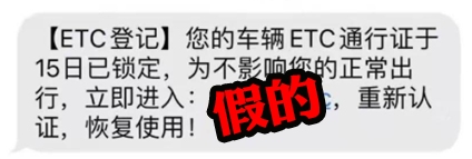 ✔ 切记“钓鱼”短信不要点,陌生电话莫轻信,办理ETC业务要到正规的网点或APP上办理。
