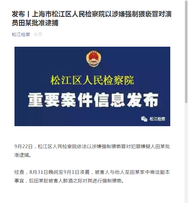 上海松江区人民检察院以涉嫌强制猥亵罪对演员田某批准逮捕 2020-09-25 22:30 松江检察微信公众号 0 9月22日,松江区人民检察院依法以涉嫌强制猥亵罪对犯罪嫌疑人田某批准逮捕。 经查,8月31日晚间至9月1日凌晨,被害人与他人至田某家中商谈剧本事宜,后田某趁被害人醉酒之际对其进行强制猥亵。 责任编辑:王凤一
