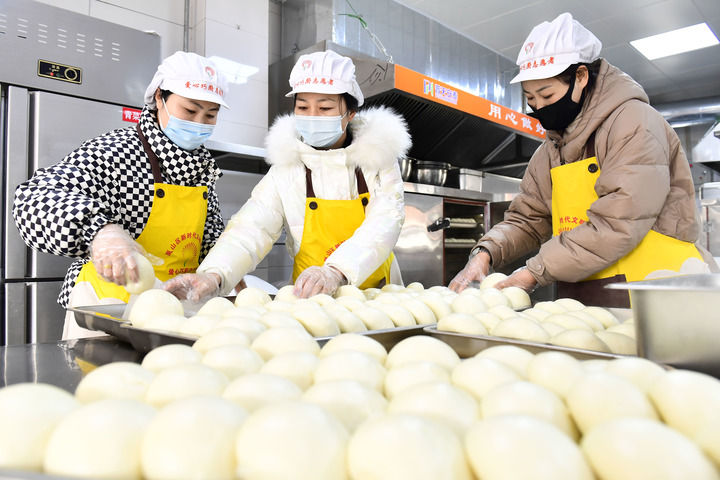 2月27日,在日照市岚山区安东卫街道凤凰山社区养老服务中心,“红辉暖心”志愿服务队队员为老人准备午餐。