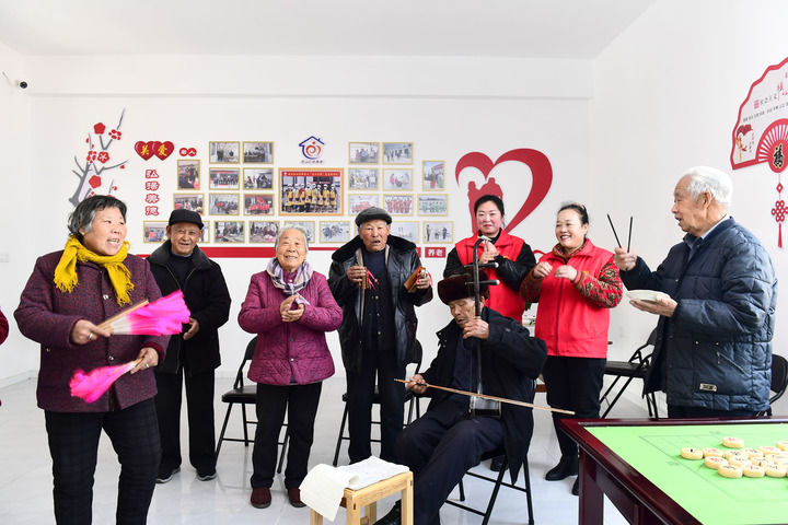 2月27日,在日照市岚山区虎山镇黄家峪村养老服务中心,老人们排练文娱节目。