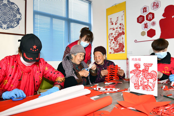 2月27日,在日照市岚山区虎山镇黄家峪村养老服务中心,两位老人边剪纸边聊天。