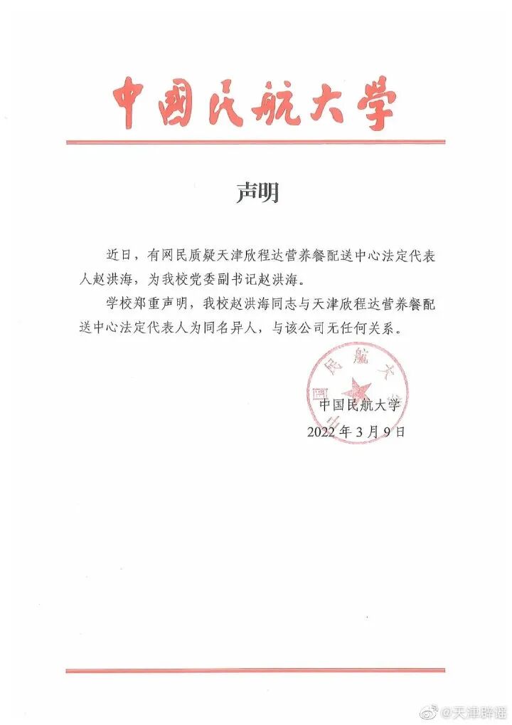 据@天津辟谣 发布消息称,近日,有网民质疑天津欣程达营养餐配送中心法定代表人赵洪海,为中国民航大学党委副书记。经过学校核实,该校赵洪海同志与天津欣程达营养餐配送中心法定代表人为同名异人,与天津欣程达营养餐配送中心无任何关系。