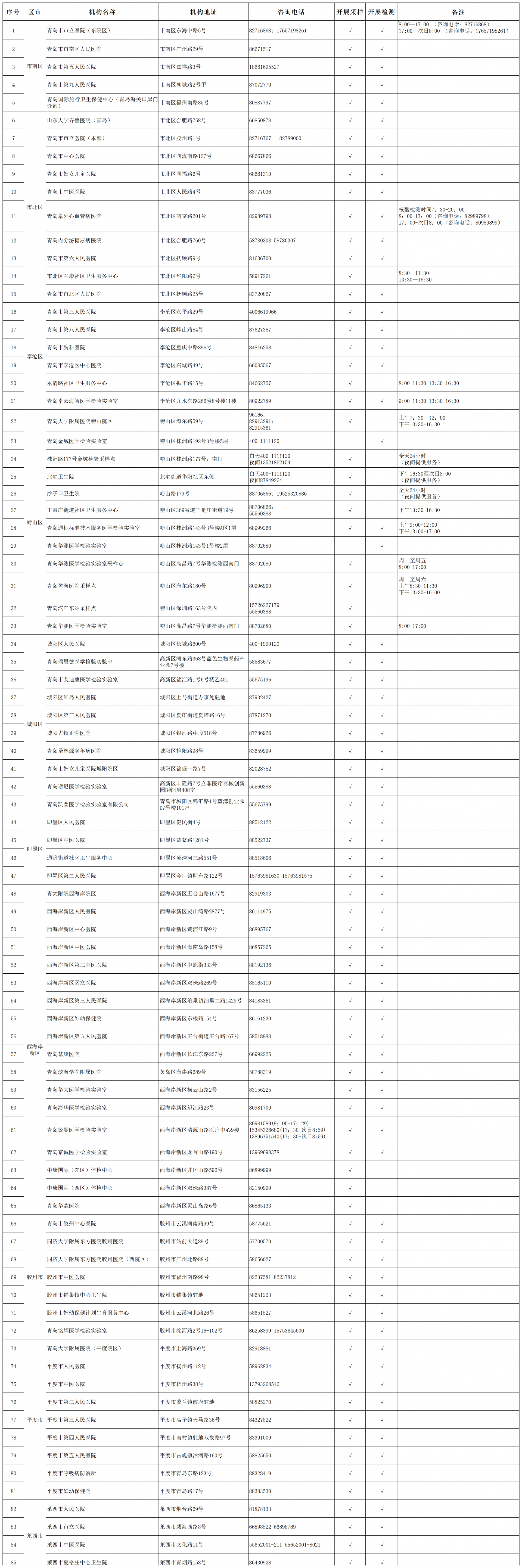 为满足广大市民新冠病毒核酸检测“愿检尽检”需求,青岛市卫生健康委收集整理全市提供核酸采样和检测服务的机构信息,供市民查询使用。相关机构应结合实际,向社会提供 24 小时核酸采样和检测服务。市民如有核酸检测需求,可提前电话咨询,并主动告知检测目的、身体状况、旅居史以及需要外文报告单等具体情况,以便相关机构及时帮助、指导做好核酸采样、检测等工作。各区市在紧急状态下临时启用的采样点信息由区市予以公布,请市民朋友及时关注。