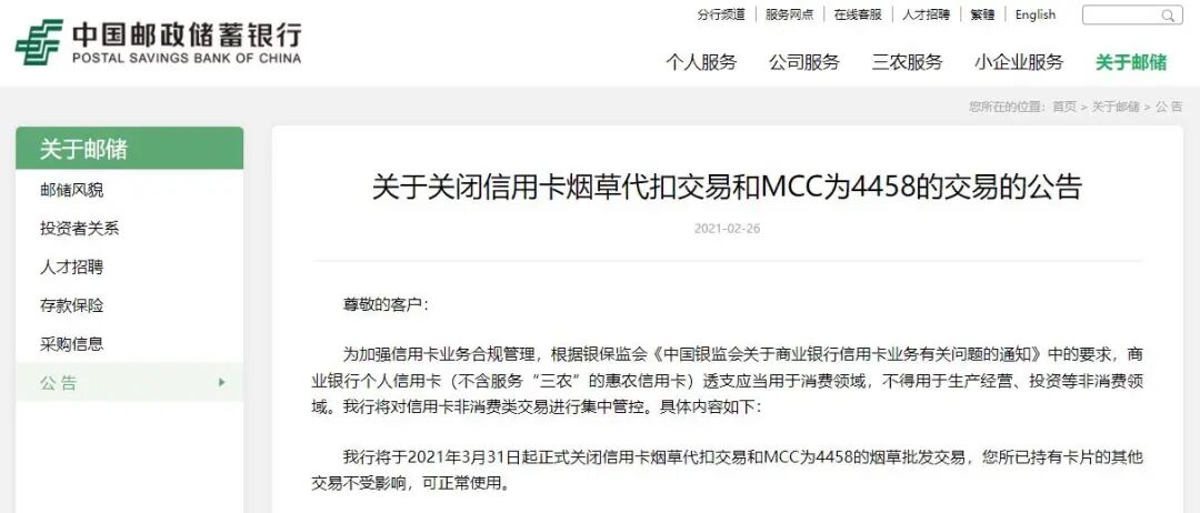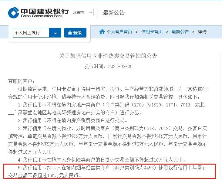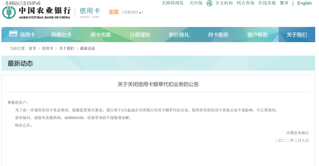 农业银行近日发布公告,将从本月起逐步关闭信用卡烟草代扣交易,此前,包括邮储银行、建设银行等多家银行也都陆续发布公告,明确信用卡资金支持消费,但不支持房地产交易以及投资等。