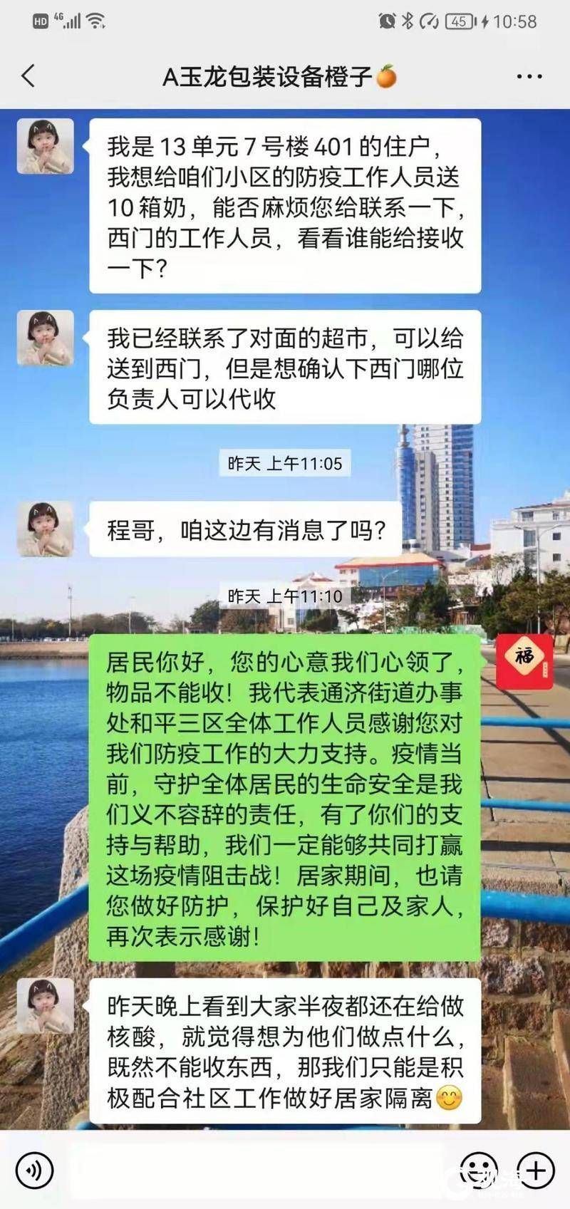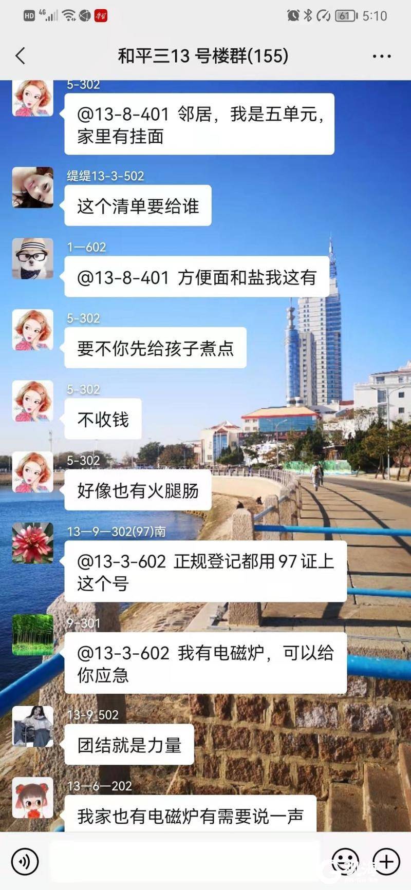 青岛日报社/观海新闻3月16日讯 “每每看到微信群里大家互帮互助,相互鼓劲加油,自己感觉有使不完儿的劲!”程亮说。程亮是即墨通济街道办事处一名工作人员,他同其他23名同事被安排到小区轮班值守,每人负责一栋楼内居民的日常生活及防疫工作。程亮负责“和平三13号楼”,他见证了微信群里,居民们守望相助的点点滴滴。