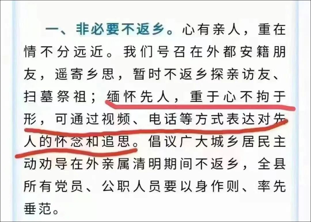 此前都安瑶族自治县新型冠状病毒感染的肺炎疫情防控工作领导小组指挥部办公室发布的《平安“清明”同心抗“疫”——致全县广大居民朋友的一封信》中写道:“缅怀先人,重于心不拘于形,可通过视频、电话等方式表达对先人的怀念和追思。”