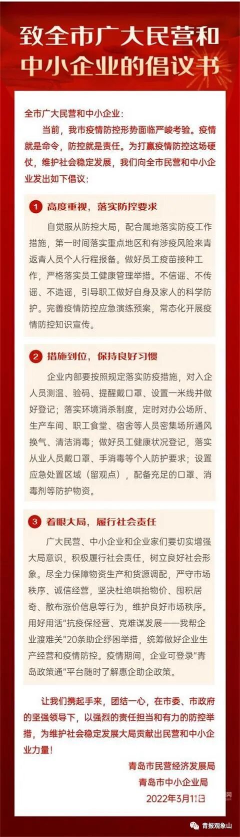 3月7日,青岛市民营经济局召开“抗疫保经营、克难谋发展——我帮企业渡难关”工作专题会,提出了四大方面20条具体措施,帮助民营中小微企业渡过难关。