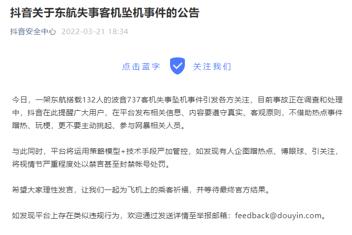 ”抖音安全中心“微信公众号21日发布公告:一架东航搭载132人的波音737客机失事坠机事件引发各方关注,目前事故正在调查和处理中,抖音在此提醒广大用户,在平台发布相关信息、内容要遵守真实、客观原则,不借助热点事件蹭热、玩梗,更不要主动挑起、参与网暴相关人员。与此同时,平台将运用策略模型+技术手段严加管控,如发现有人企图蹭热点、博眼球、引关注,将视情节严重程度处以禁言甚至封禁帐号处罚。