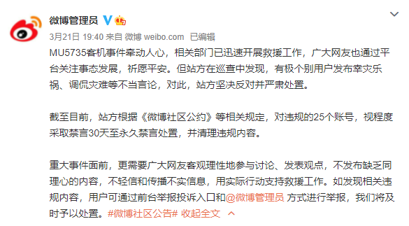 微博处置25个调侃坠机灾难账号